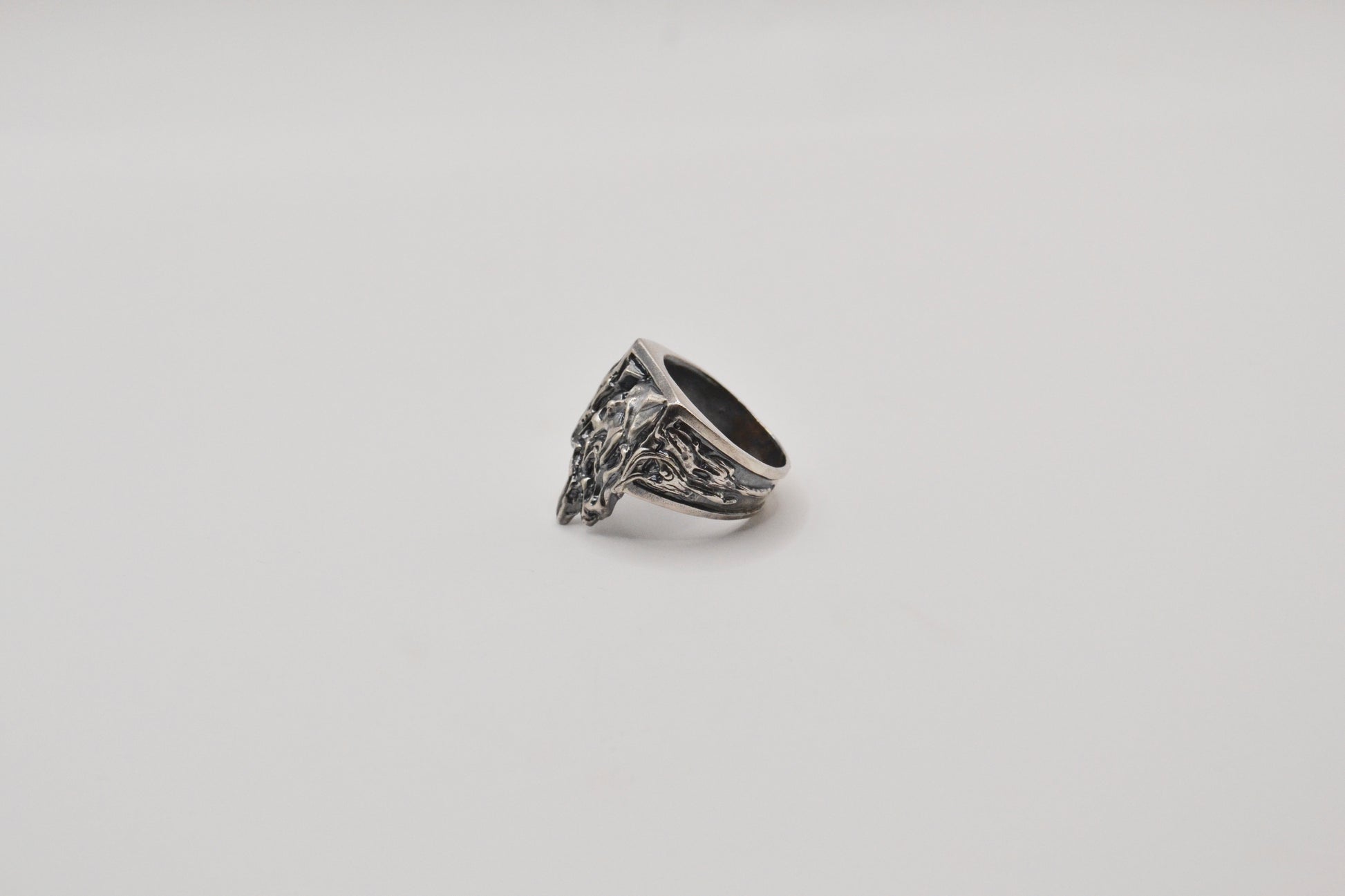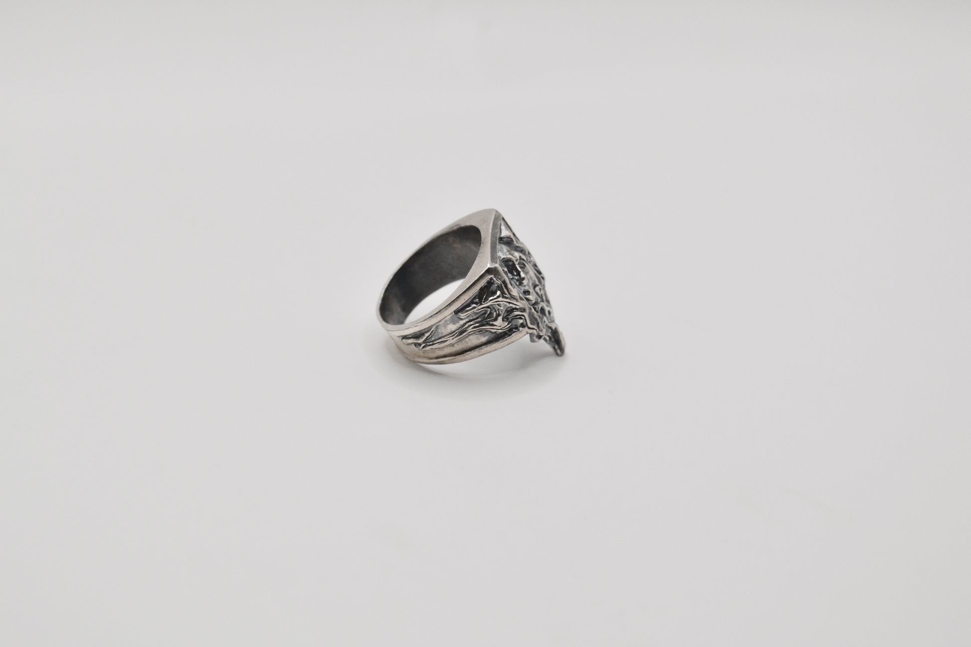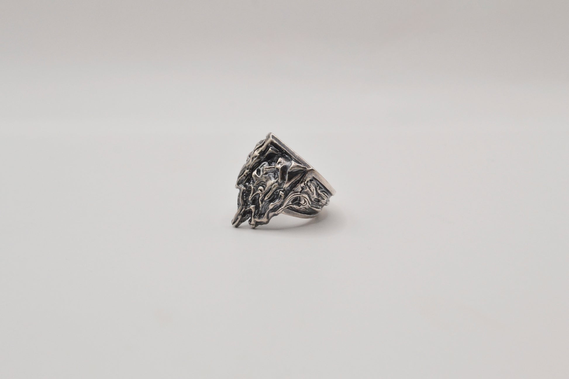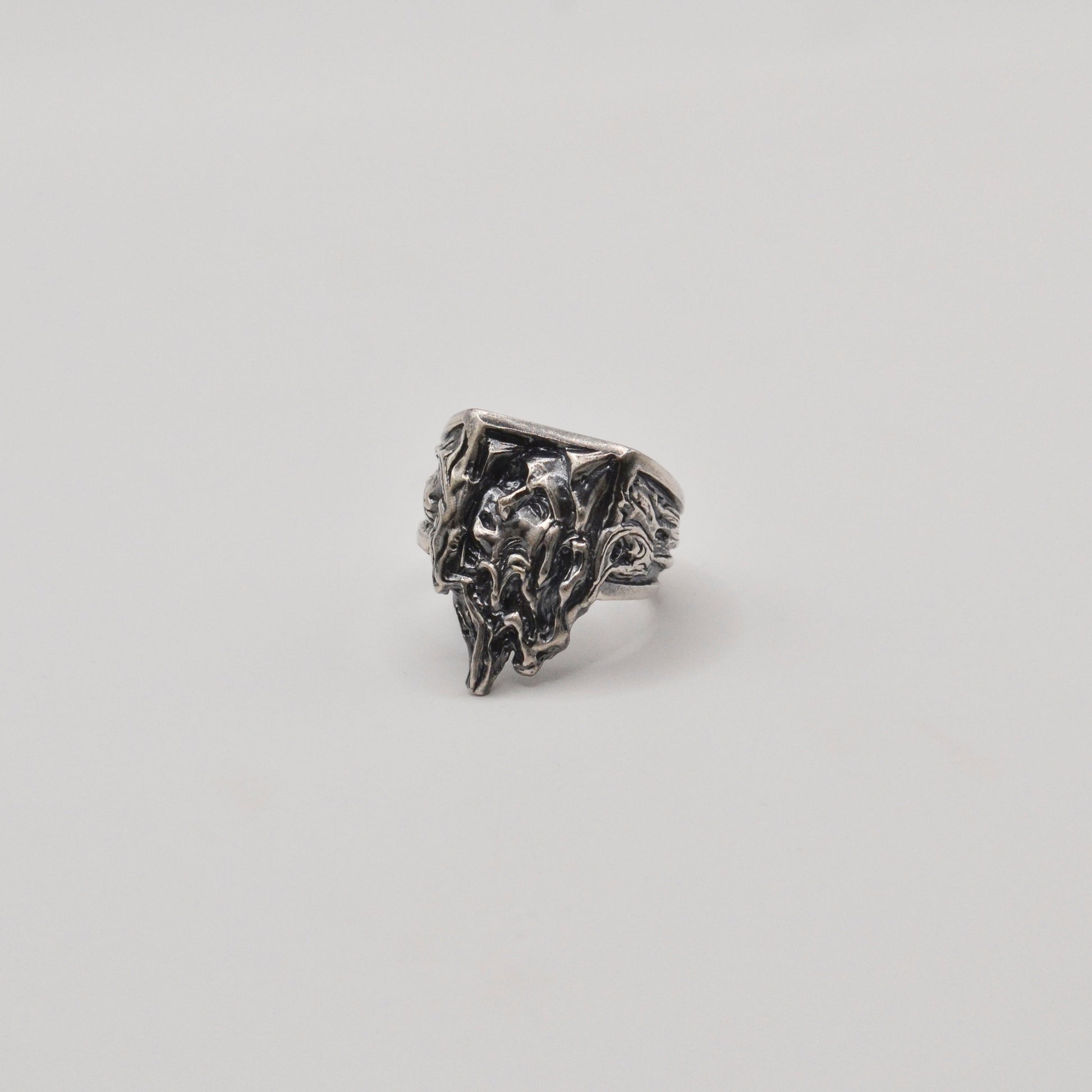 精細的雕刻勾勒出聖母的輪廓臉上的表情如同畫作般定格於畫框內隨著悲傷神態的流動,聖母的臉龐逐漸融化流下液體般的形狀從畫框外延伸至戒指的側面彷彿悲傷正從畫作中滲出,流向現實世界融化的部分象徵著無法停止的悲傷與聖母的柔美形成強烈對比將痛苦與美麗永恆化