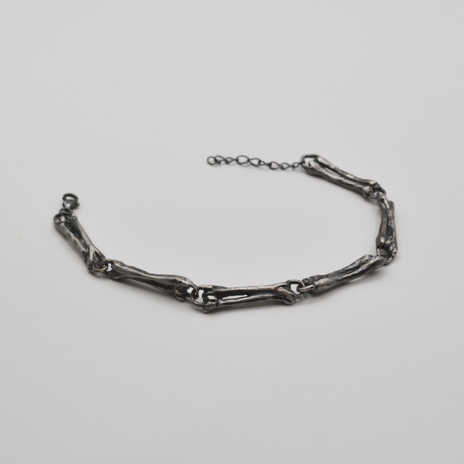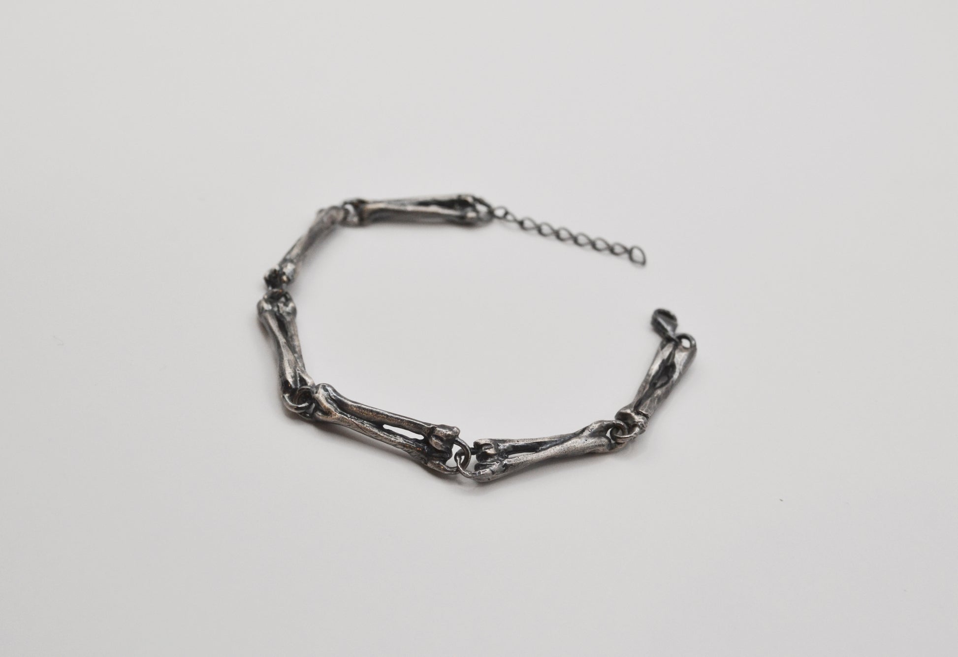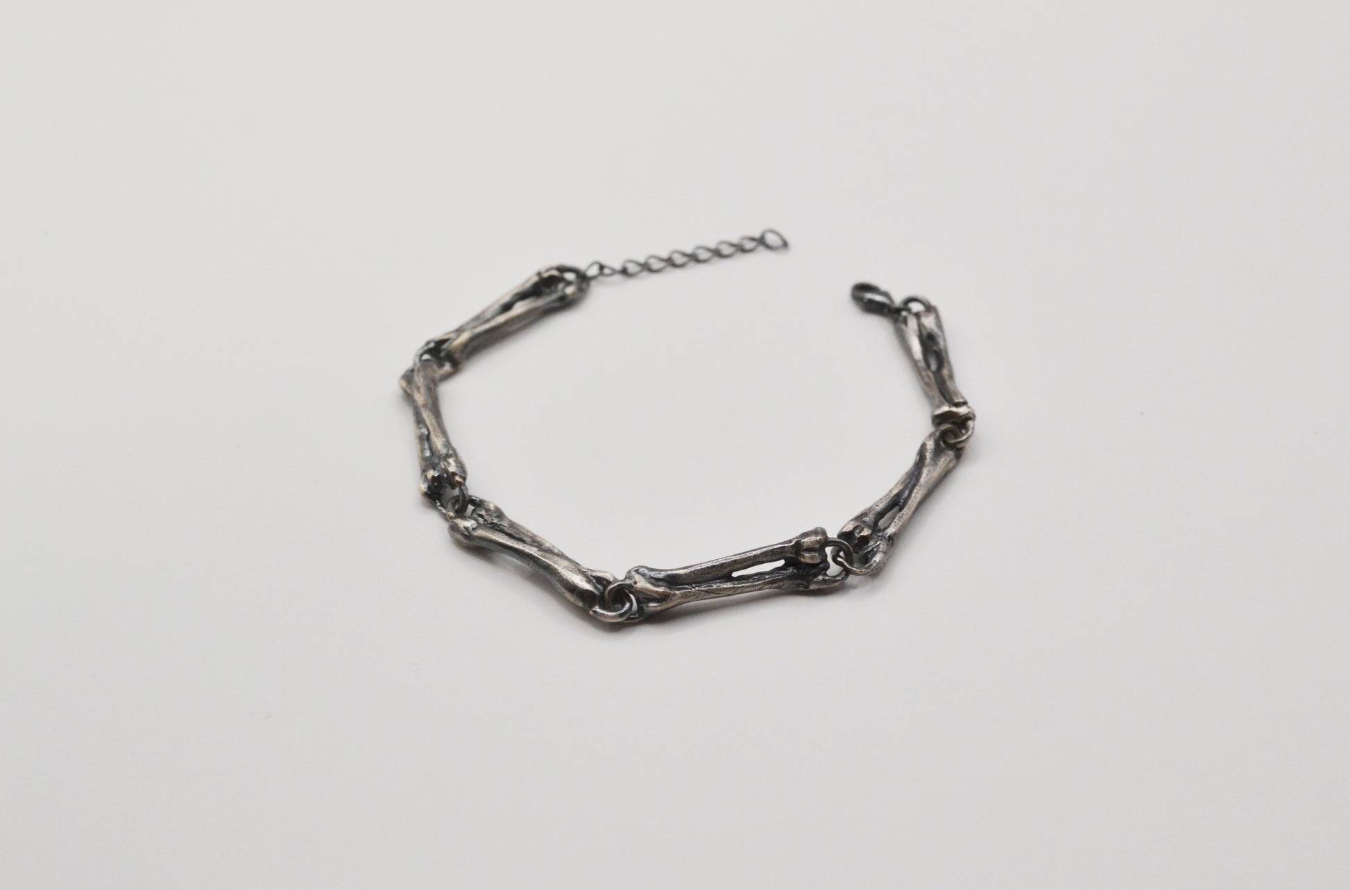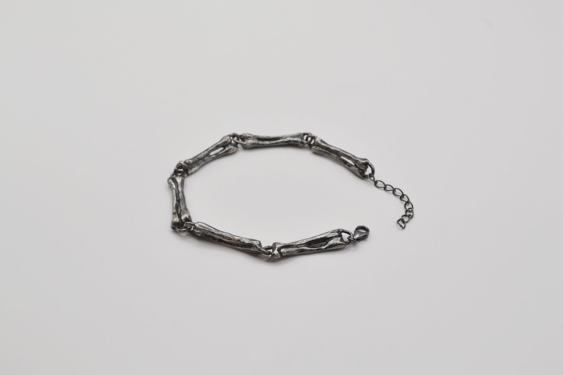 這條手鍊由上手臂的骨頭構成,每一段尺骨與橈骨以其原始形態呈現,並通過精緻的鎖鏈單元相連結,賦予手鍊一種無機與有機交織的特色。每一段骨頭獨立而不交錯,簡潔地排列展現出自然的結構美感。
