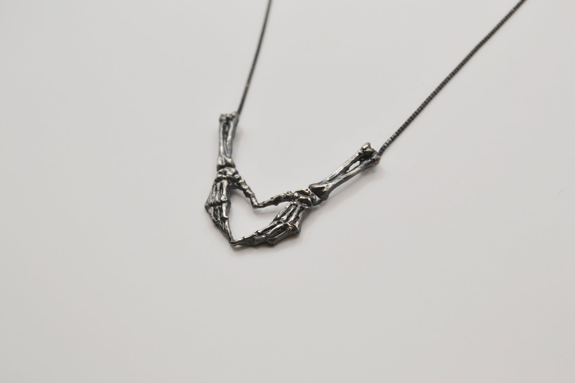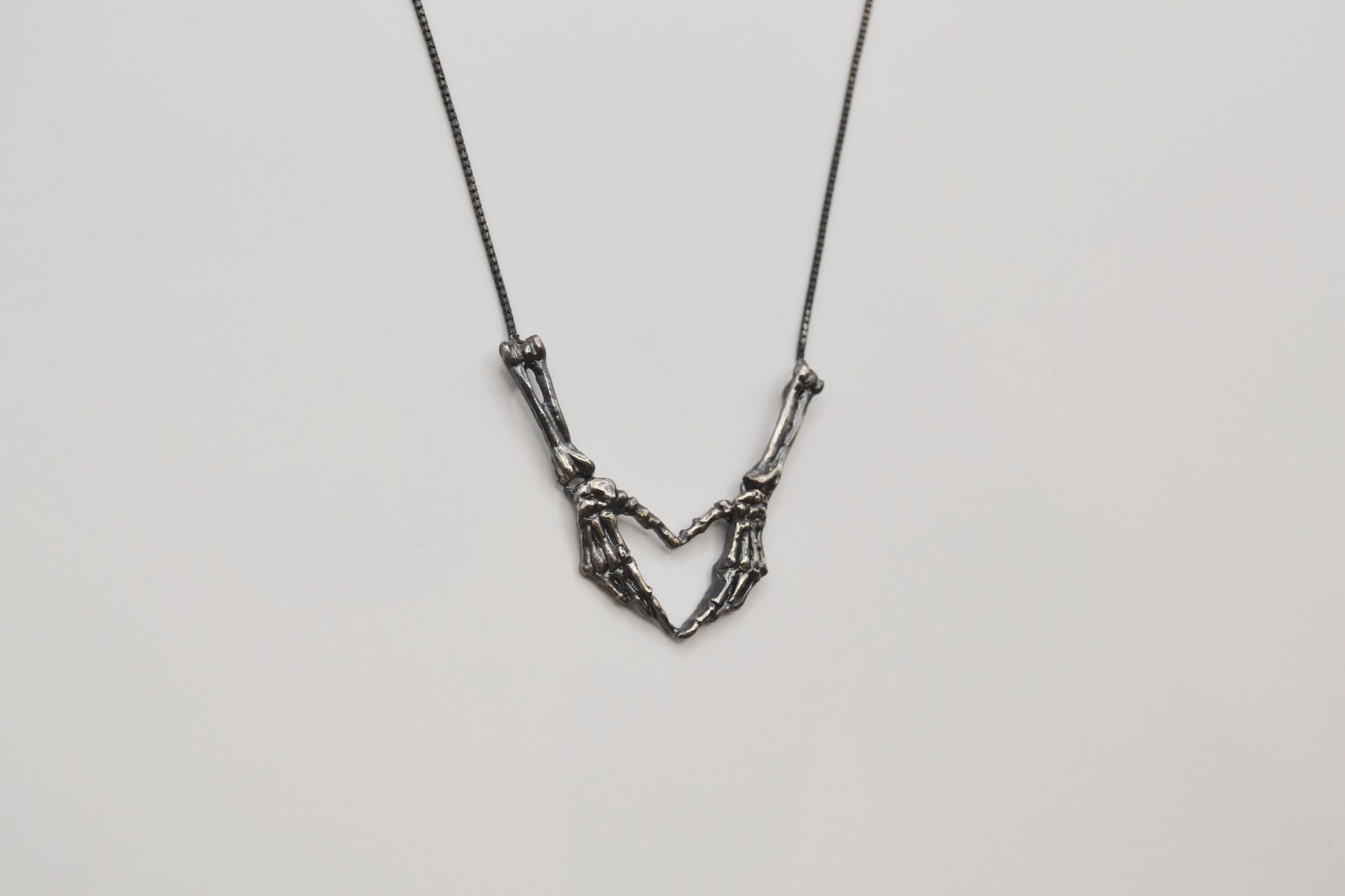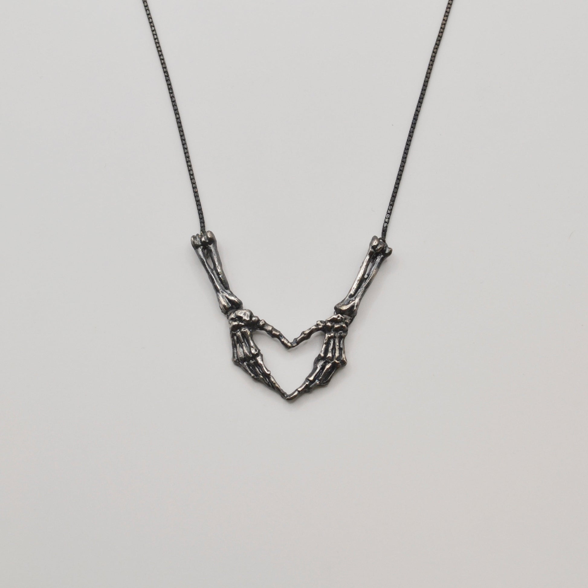 沒有愛心符號而是由兩隻骨骼手掌交疊構成形成一個獨特的愛心輪廓寫實的骨骼刻畫與象徵性的手勢語言互相碰撞彆扭而真誠的可愛手骨的設計也可解讀為超越生死的承諾表達對情感的堅定與永恆