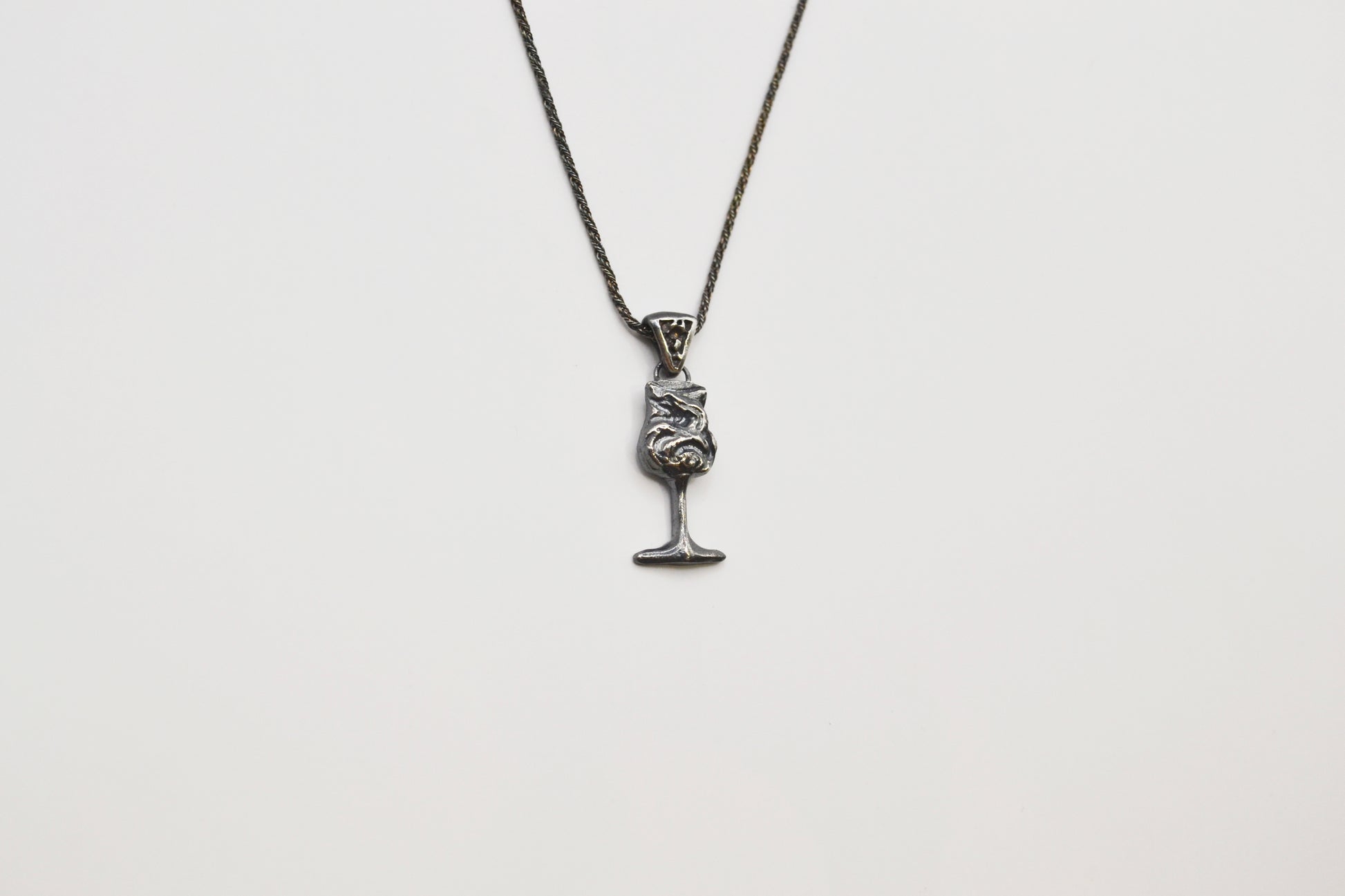 酒杯輪廓細長,深淺雕刻不規則的流動紋理,宛如液體在杯中翻湧,無意間捕捉到的某一個當下。杯身圓潤,杯腳纖細而穩固,延伸出古典優雅的輪廓,對比著杯身的寫意流線紋理,使整體設計帶有一絲詭譎的美感。
