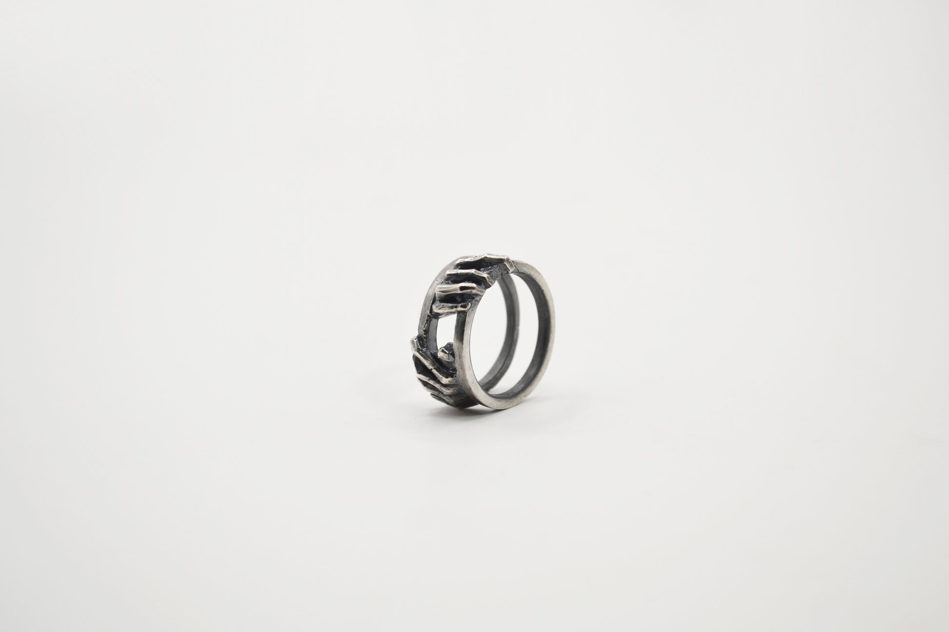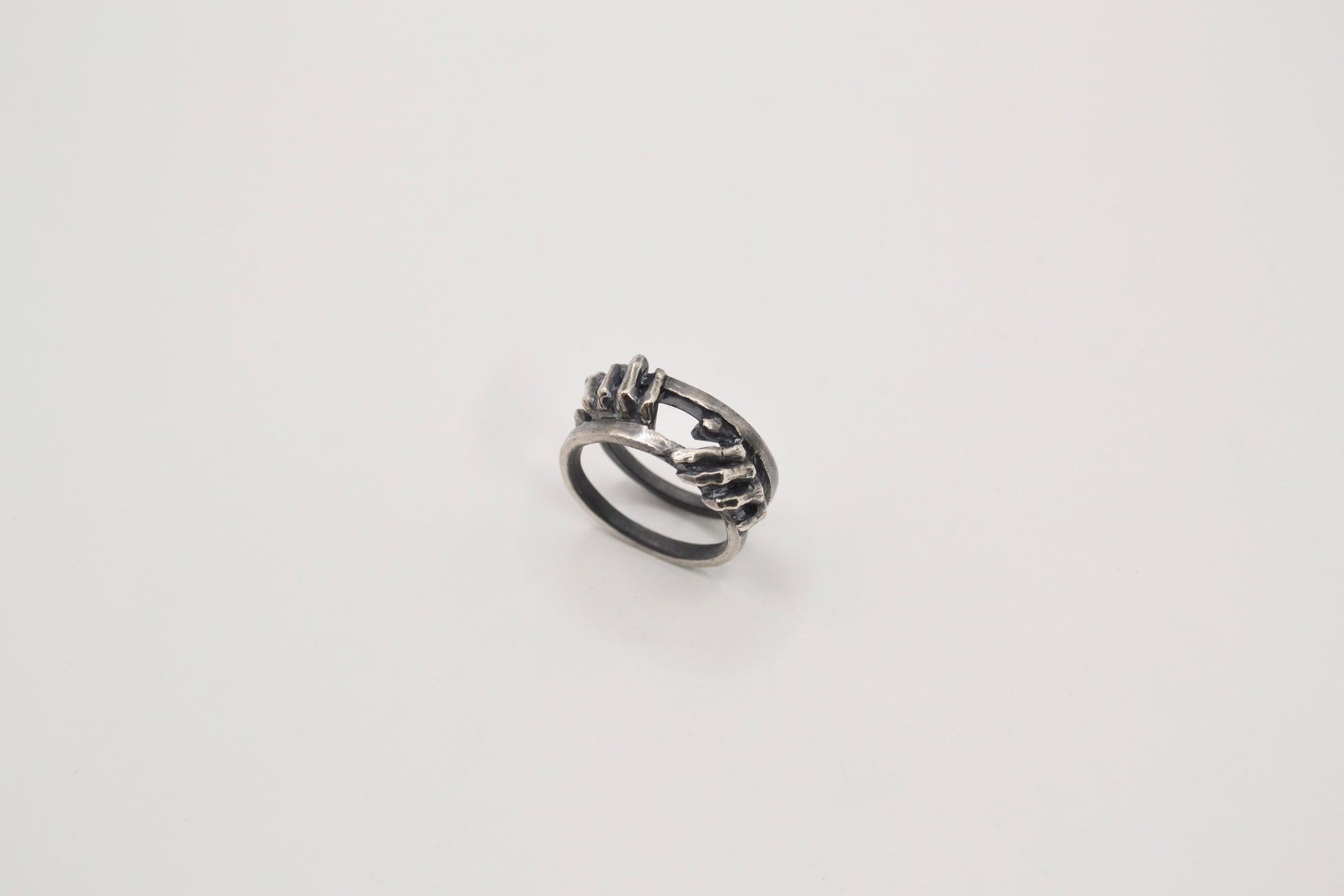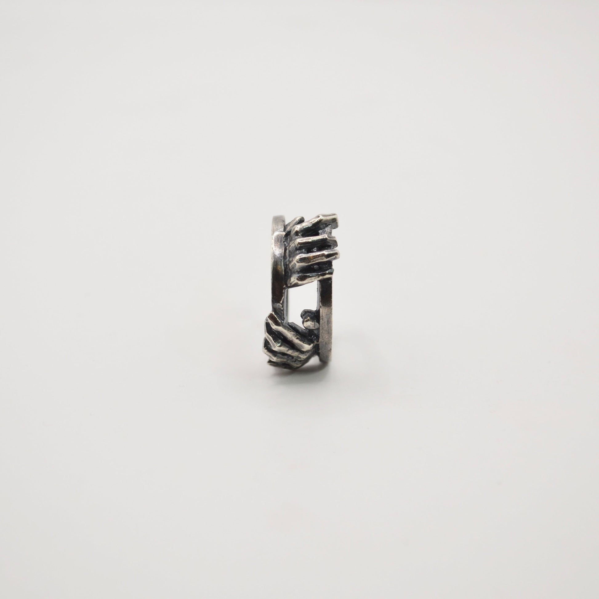 《指與掌系列-闔上》雙手將門扉緩緩闔上留下那道縫隙光影流動屏息的瞬間時間被延展,空間凝聚壓縮在張力之間-材質:925純銀戒面長度:6mm重量:8.5g